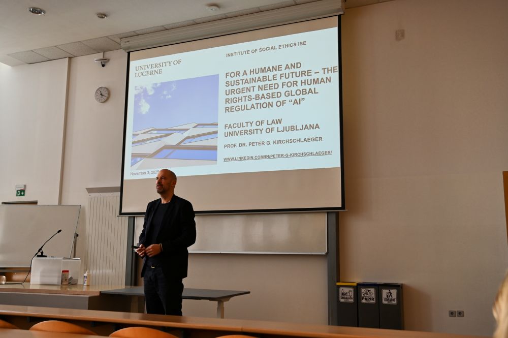 V ponedeljek, 3. novembra 2025, smo na fakulteti gostili prof. dr. Petra G. Kirchschlägerja, strokovnjaka na področju etike umetne inteligence, digitalne preobrazbe in človekovih pravic, ki je izvedel predavanje z naslovom For a Humane and Sustainable Future – The Urgent Need for Human Rights-Based Global Regulation of ''AI''.