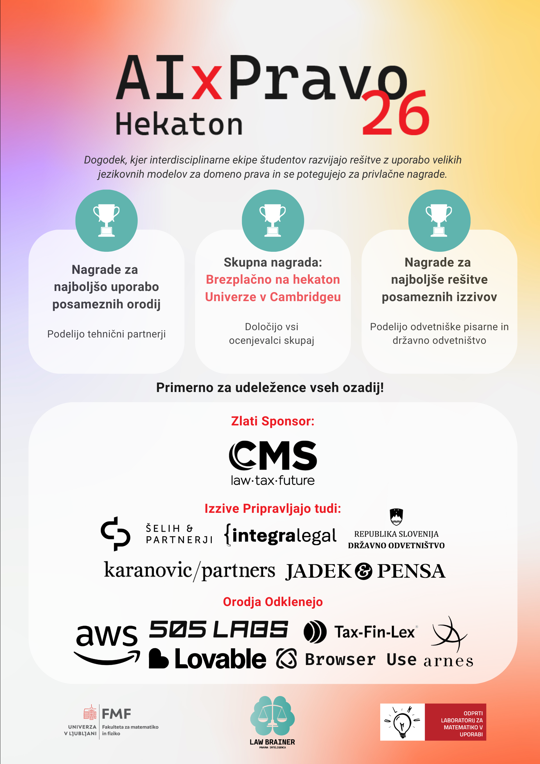 Orodja odklenejo tehnični partnerji: Tax Fin Lex , Amazon Web Services, Lovable, Browser Use, 505 Labs, ARNES.