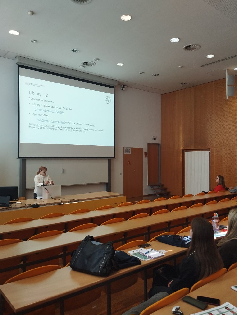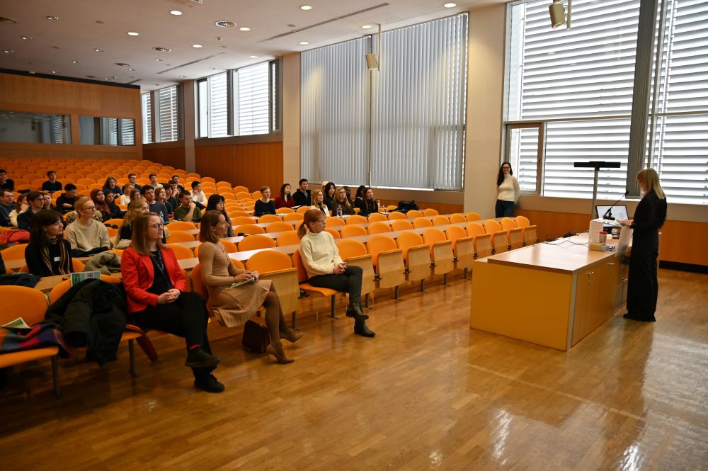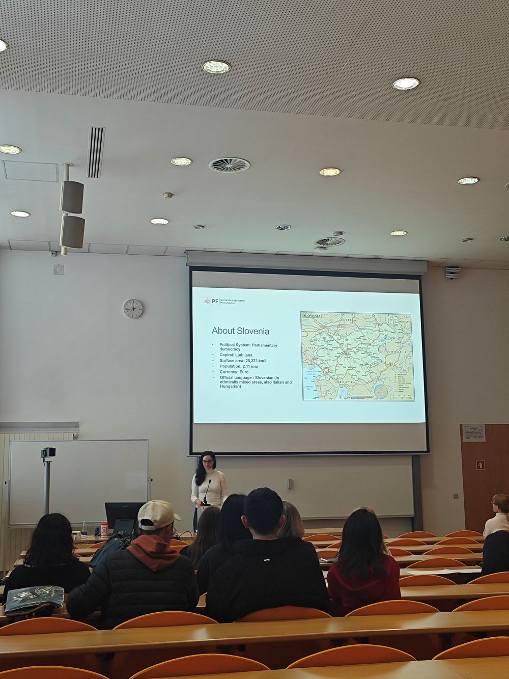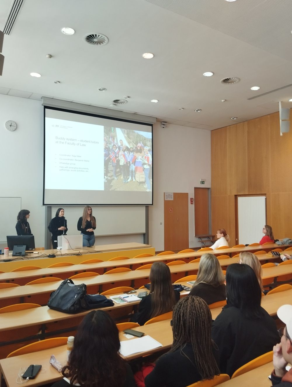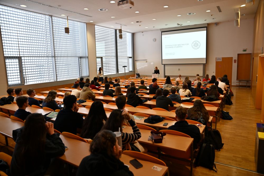 V torek, 17. februarja 2026, je fakultetna mednarodna pisarna organizirala uradni sprejem za 52 tujih študentov iz več kot 20 različnih držav, ki na Pravni fakulteti v Ljubljani opravljajo študentsko izmenjavo. Na uvodnem srečanju in informativnem sestanku v zlati predavalnici jih je najprej imenu vodstva nagovorila prodekanja za študijske zadeve, izr. prof. dr. Bruna Žuber. Potem sta sledili predstavitvi Lee Kremič iz mednarodne pisarne in Alenke Peterka iz knjižnice, in sicer o organizaciji Univerze v Ljubljani, Pravne fakultete ter o različnih storitvah, ki jih svojim uporabnikom nudi knjižnica na Pravni fakulteti. Študentje so prejeli tudi informacije o možnostih obštudijskih in športnih dejavnosti. Med drugim so tuje študente pozdravili tudi študentski predstavniki, tako naši tutorji za tuje študente kot tudi predstavnik ESN Ljubljana, ki so na kratko opisali svoje aktivnosti. Študenti so na srečanju dobili posebno informativno brošuro in vrečko s fakultetnim promocijskim materialom.